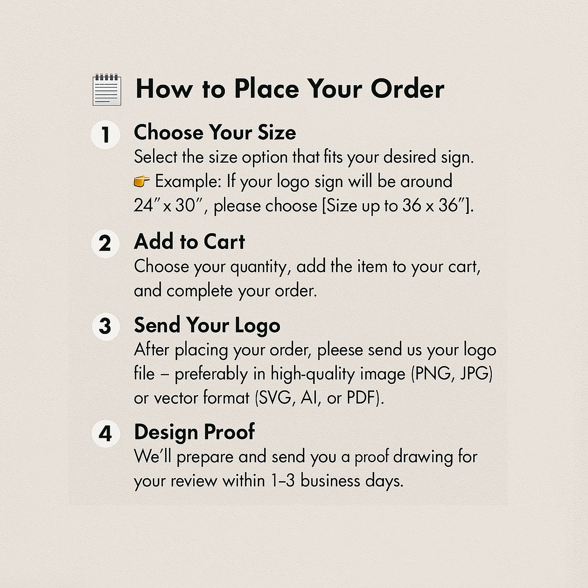 👉 Example: If your logo sign will be around 24" x 30", please choose [Size up to 36" x 36"].